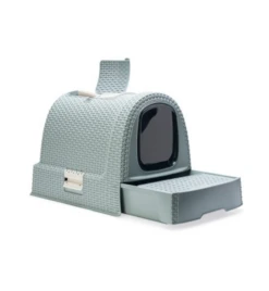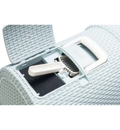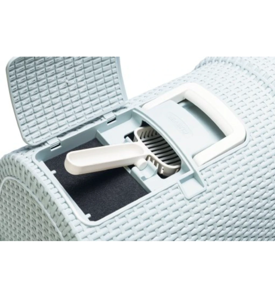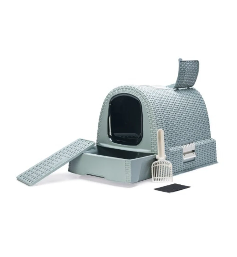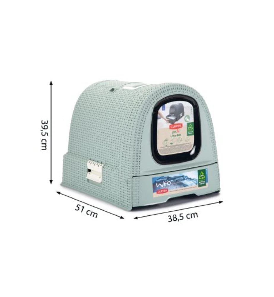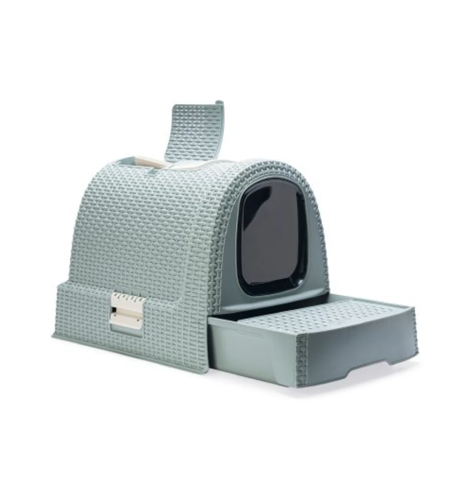 De Curver kattenbak heeft een modieuze uitstraling doordat het een motief heeft van gevlochten rattan. De lade aan de voorkant heeft een plateau met gaatjes, waardoor de kat een groot deel van het kattenbakgrit achterlaat in de bak alvorens de kattenbak te verlaten. Door de uitschuifbare lade kan je in een oogopslag zien of de kattenbak aan verschoning toe is. Aan de bovenkant van de kattenbak bevindt zich een klepje waar de kattenbakschep opgeborgen kan worden.