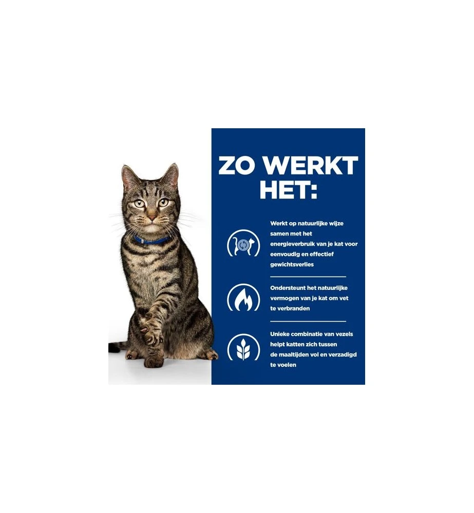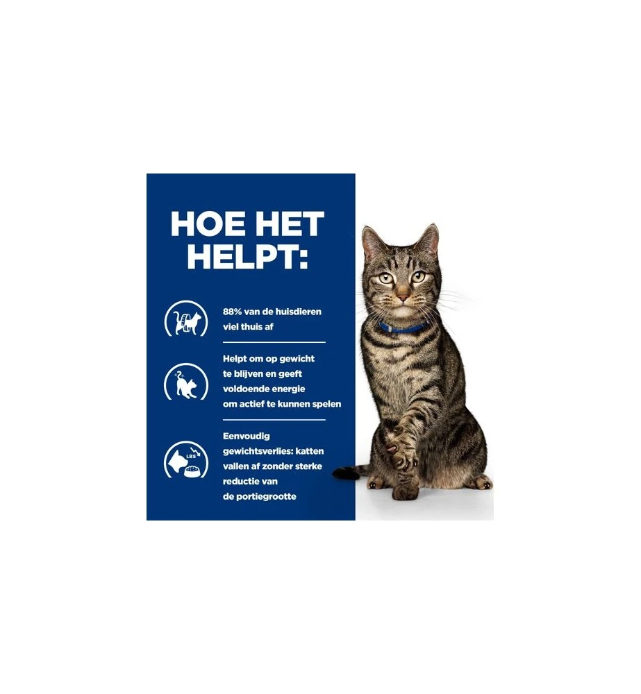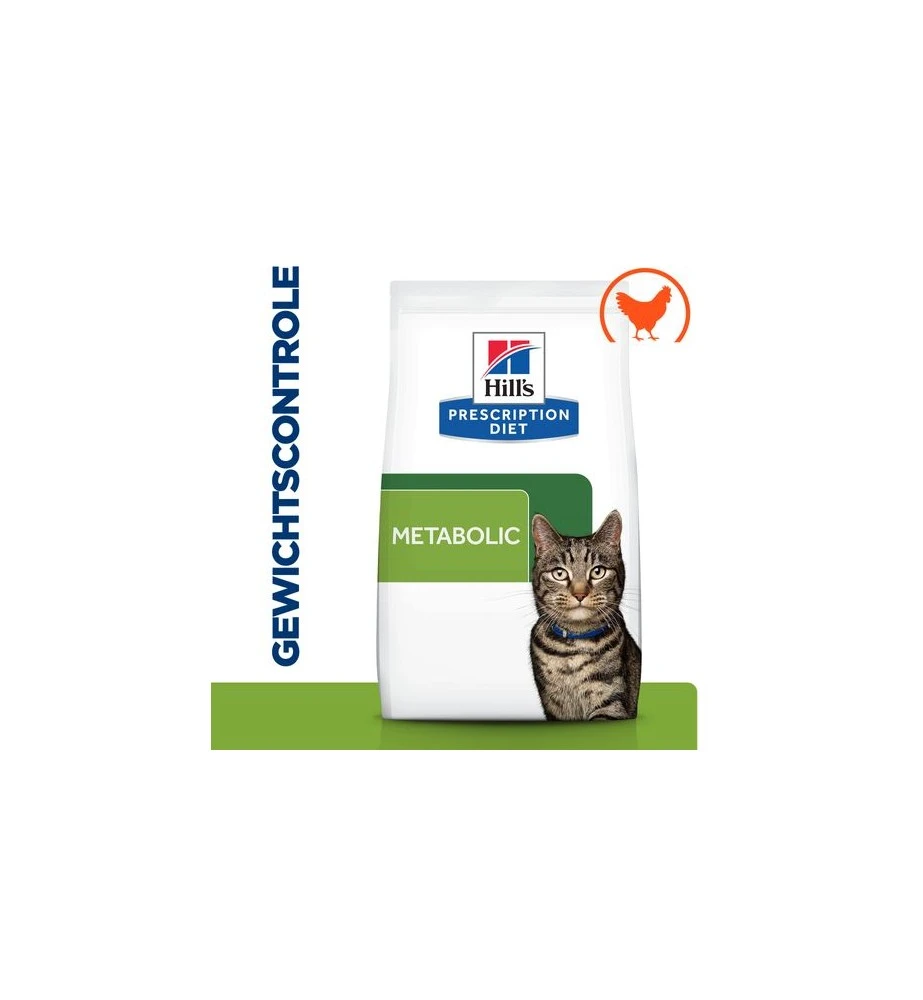 De Hill’s Prescription Diet Metabolic & Weight Management dieetvoeding is een volledige vetarme droogvoeding voor katten die te maken hebben met overgewicht (obesitas). De voeding heeft een stimulerend effect op het natuurlijke vermogen van het lichaam om vet te verbranden. Bij het Hill’s Metabolic & Weight Management dieet is klinisch bewezen dat het binnen 2 maanden zorgt voor een reductie van 11% lichaamsvet.